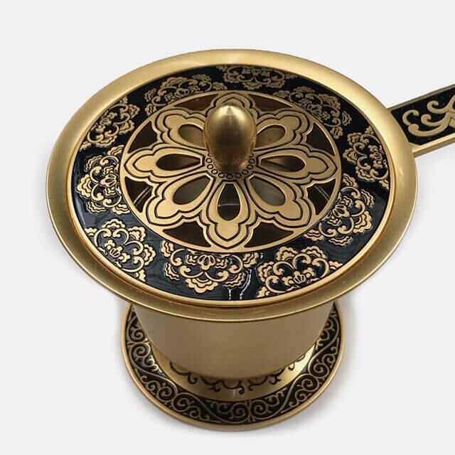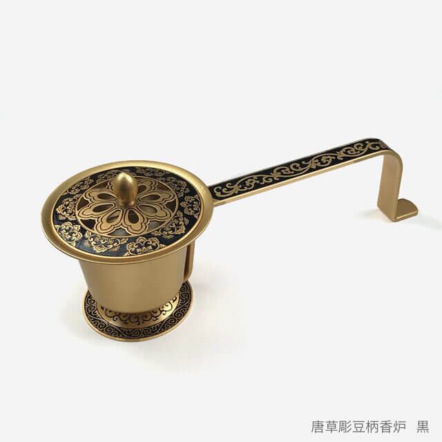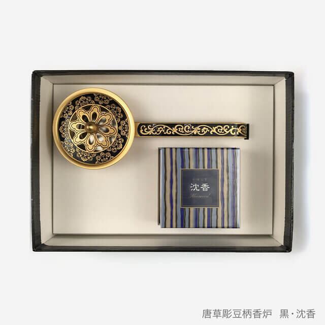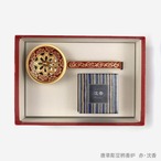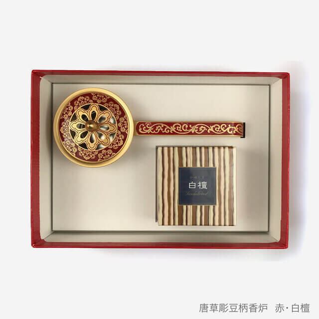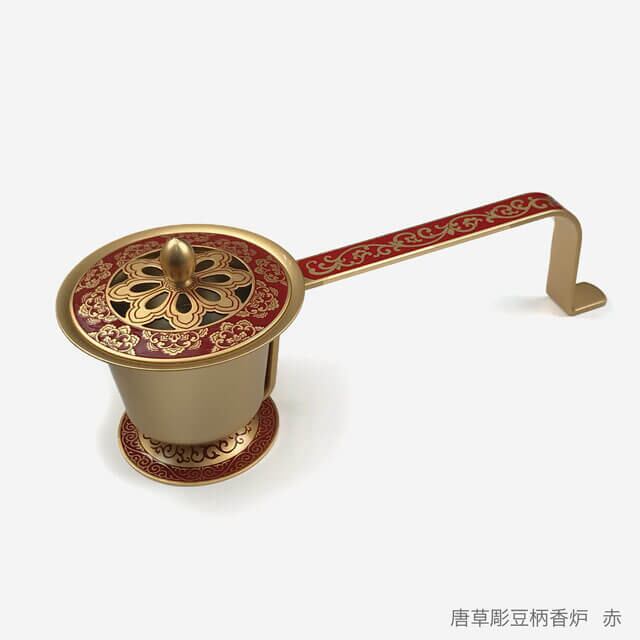 エッチングで唐草模様を施し、色を足しこんだ真鍮製の小さな柄香炉。コーンタイプの御香を焚いていただける仕様で、居間、応接間、玄関先などで気軽に御香を楽しめます。鮮やかな赤と気品のある黒の全二色です。 サイズ:約 長168×巾63×高70mm 箱縦72×横171×高72mm 素材:真鍮