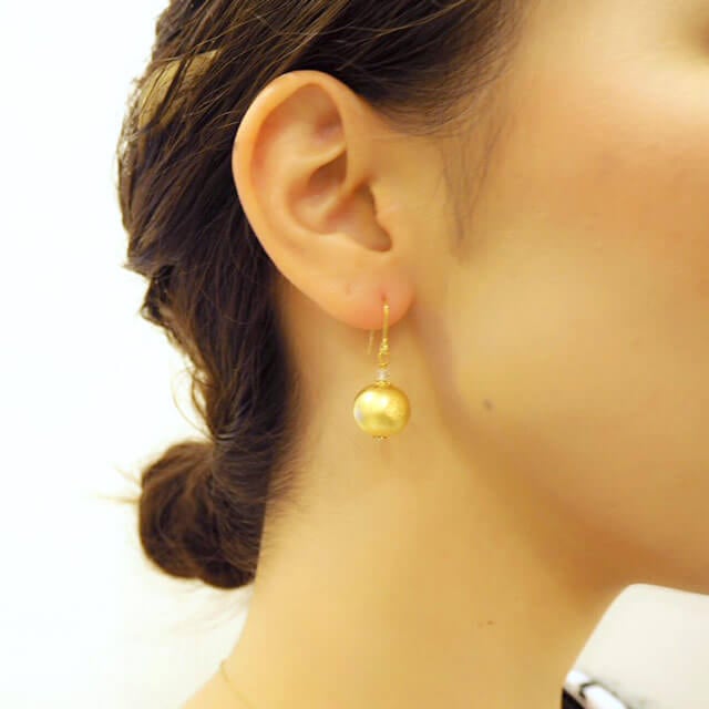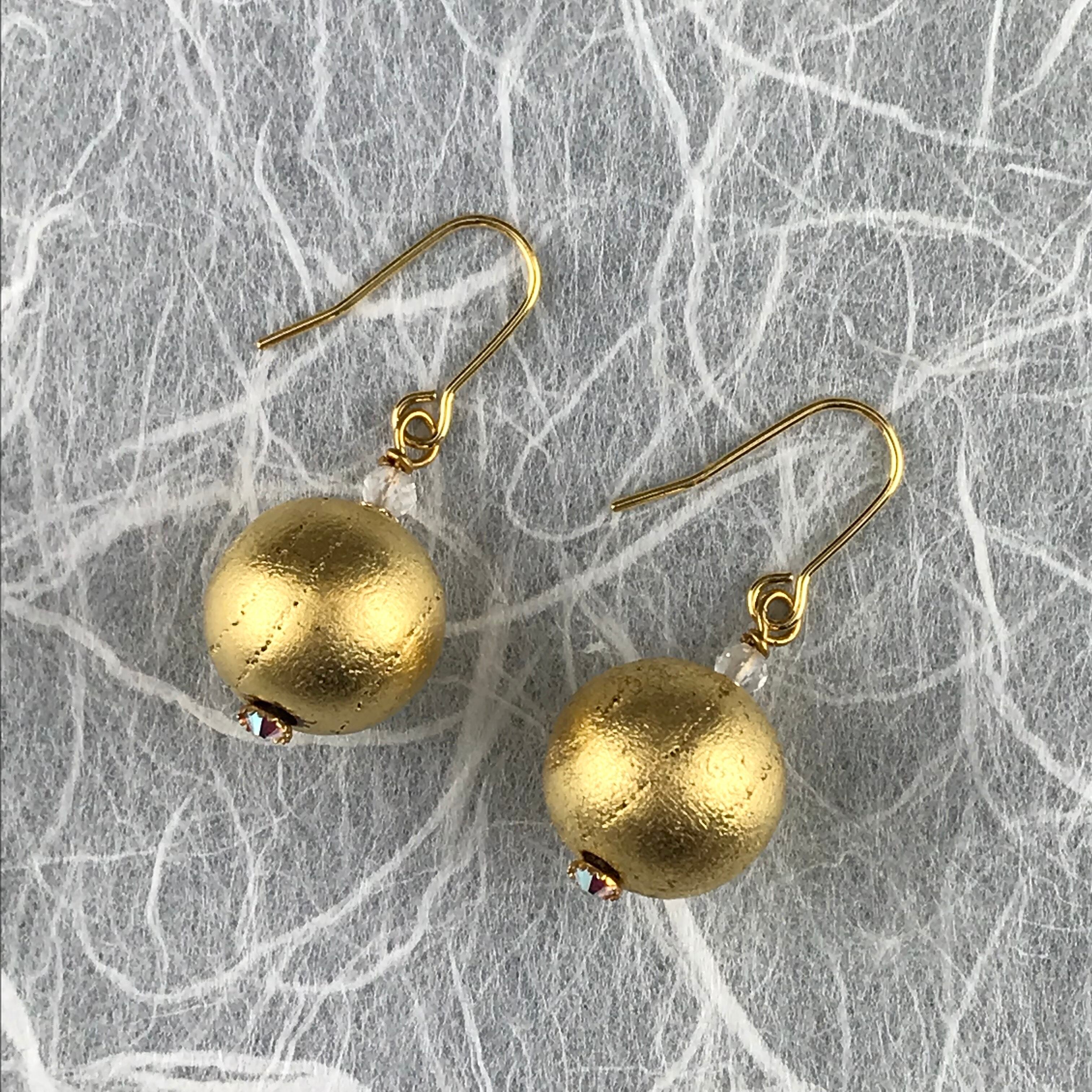 お数珠の玉でつくったピアス。純金箔仕上げです。 サイズ:木玉約 w120mm 素材:欅・金箔