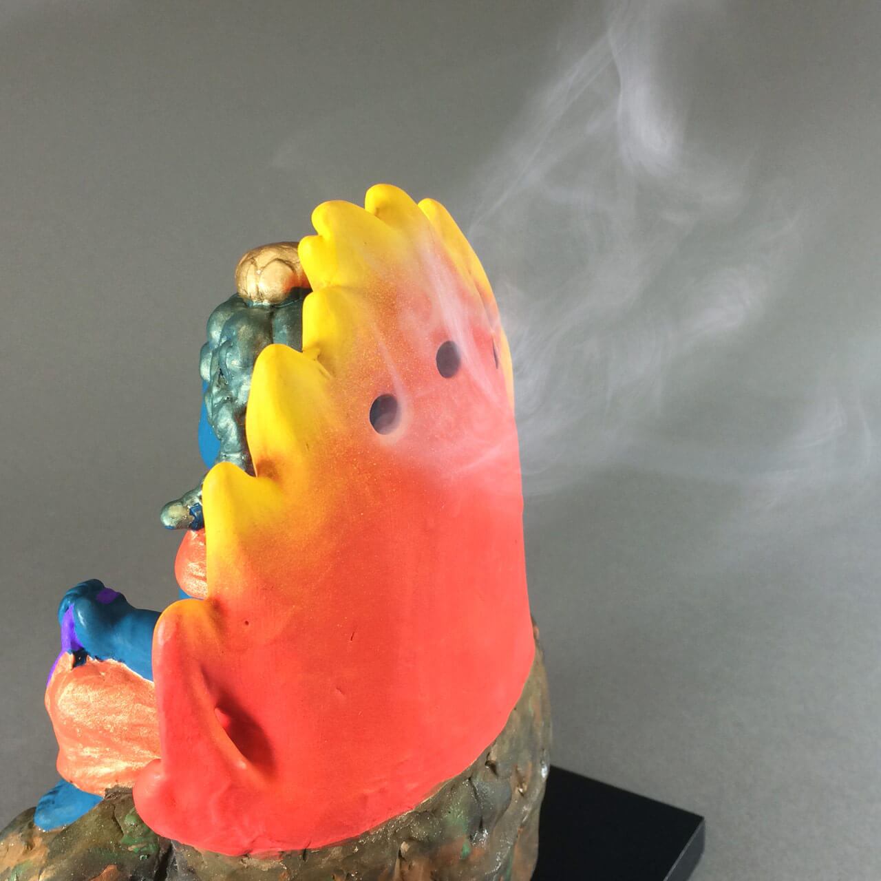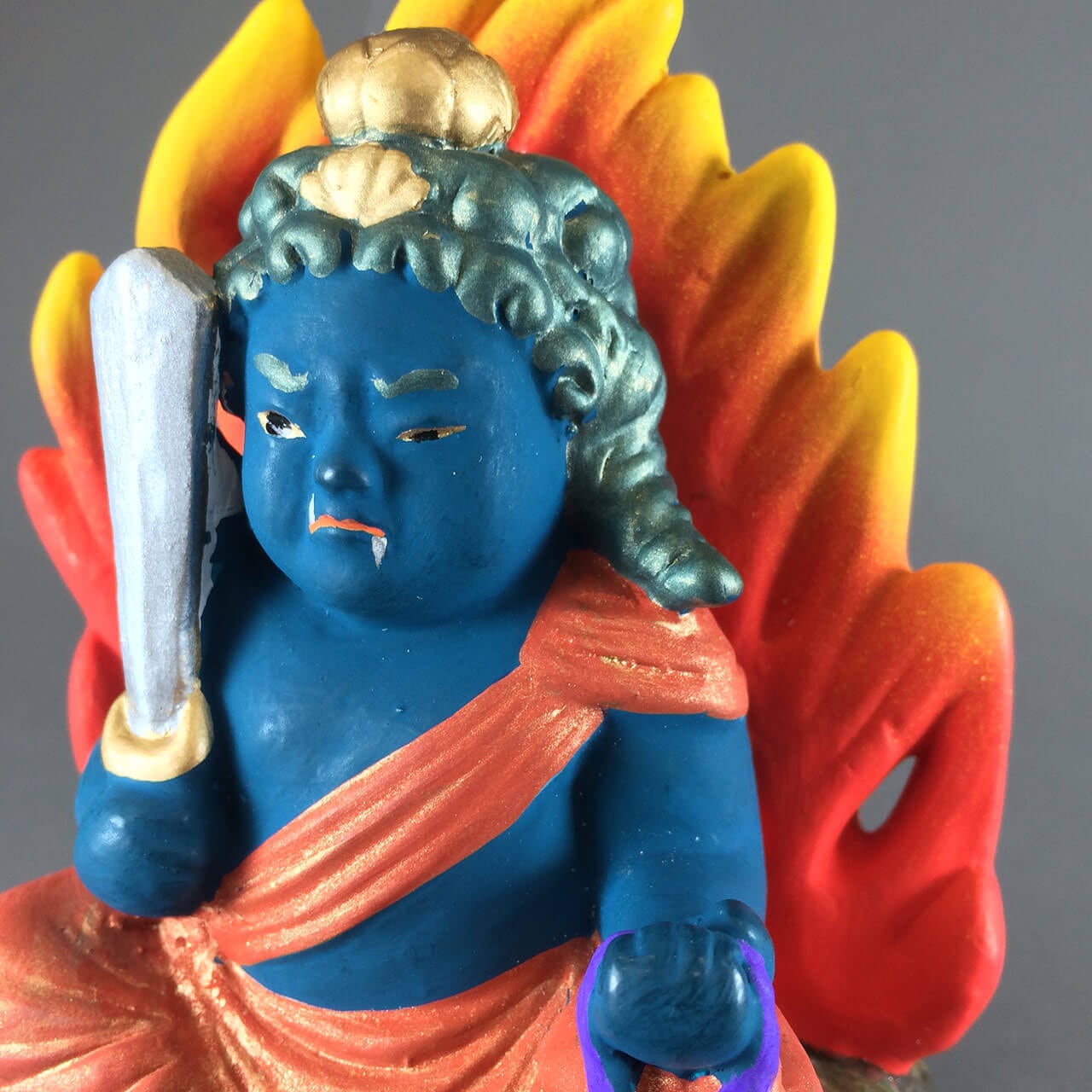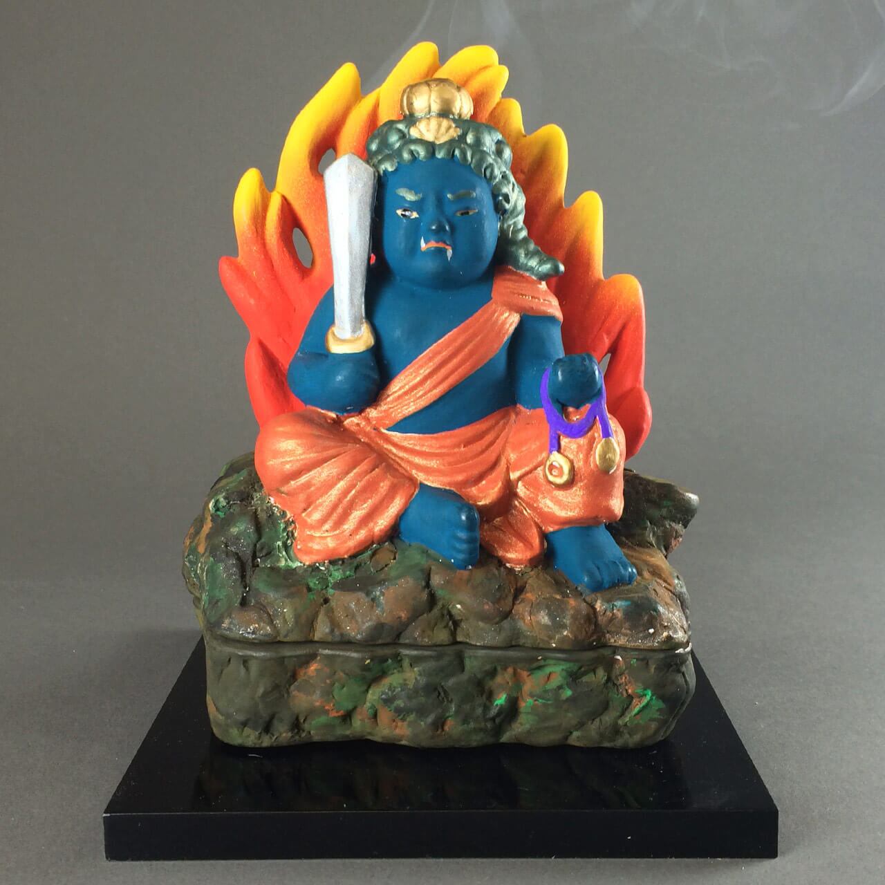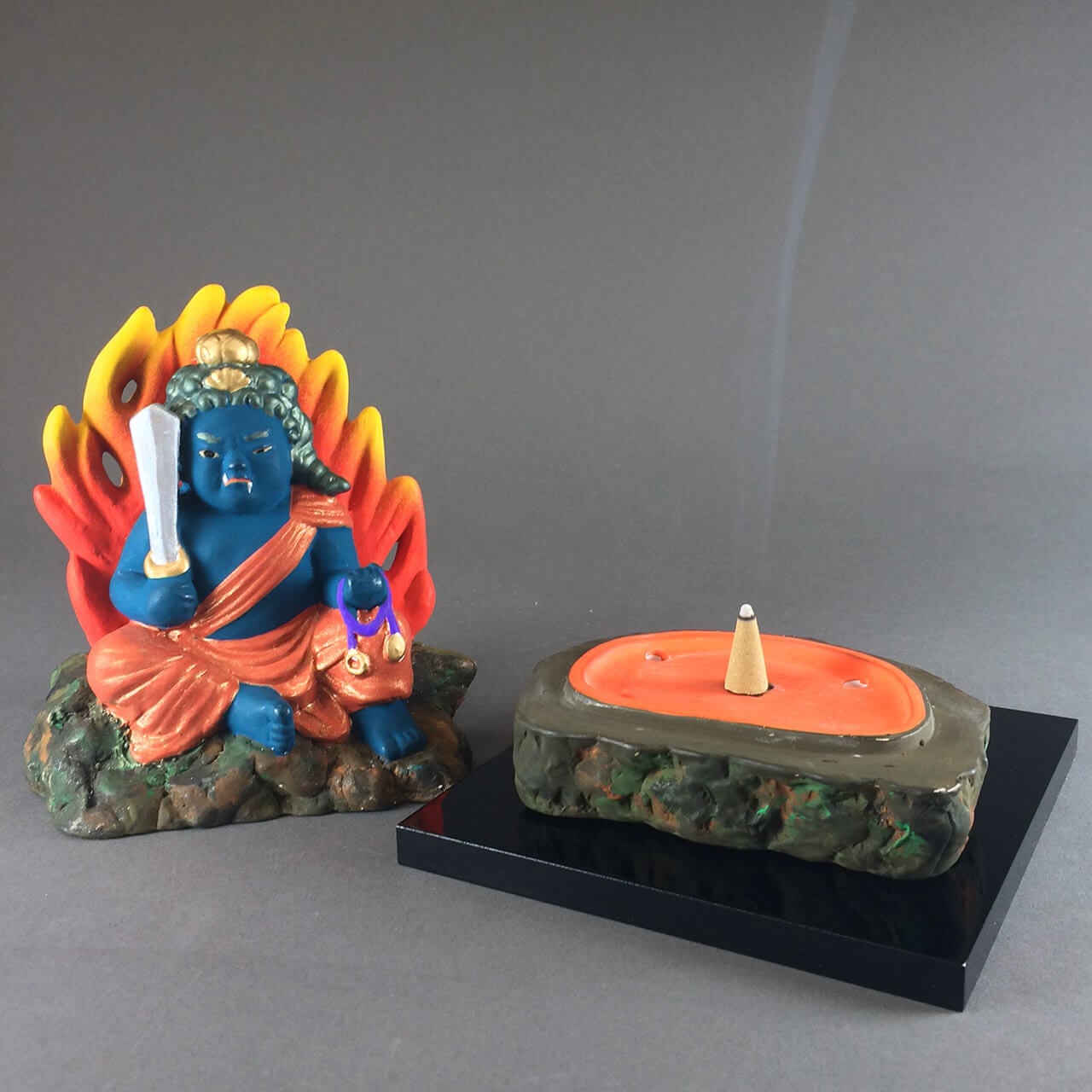 京都の伝統工芸品「陶人形」の特徴である、素焼き独特の風合を活かし、いままでにない可愛らしい「お不動さん」の香炉に仕上げました。仏間はもちろんのこと、玄関やリビングでも気軽に御香を楽しんで頂け、贈答品にも喜ばれる一品です。 サイズ:約 h140/w115/d75mm